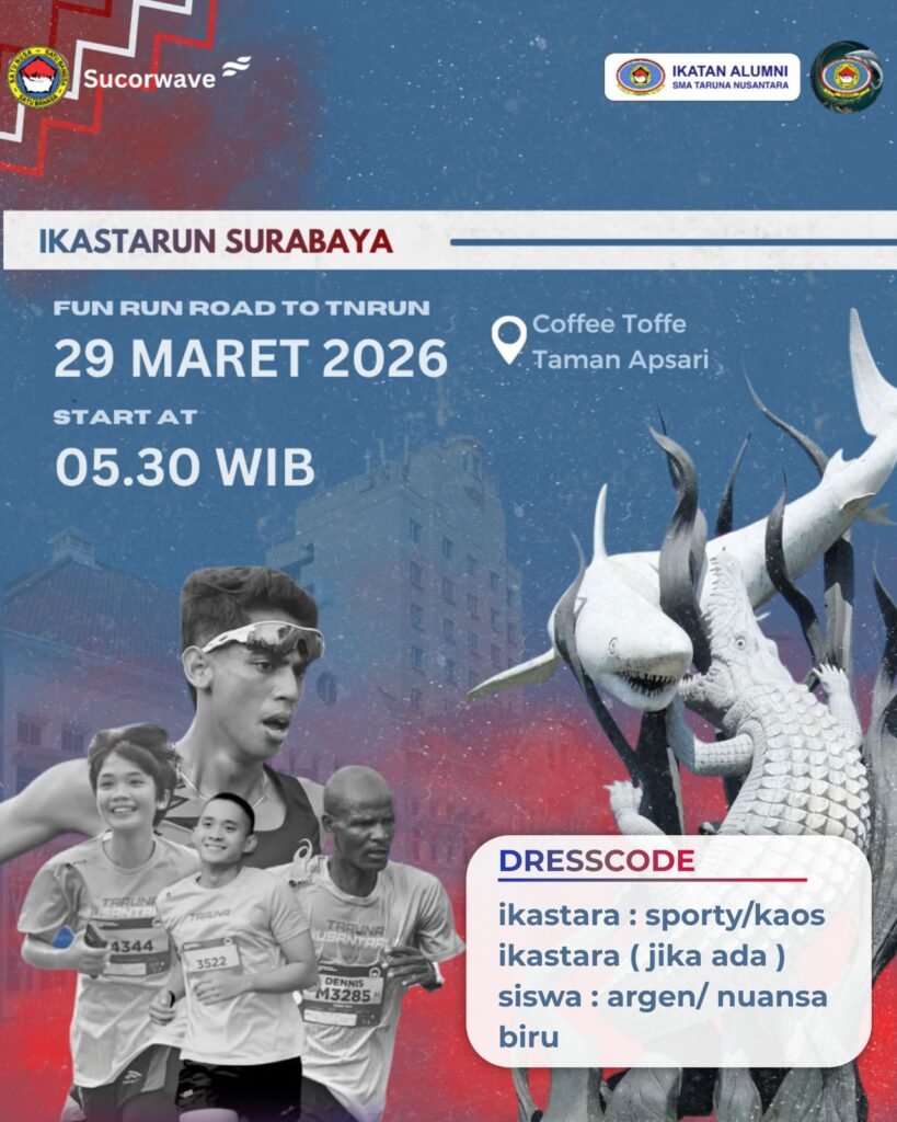 Dalam rangka menyambut kegiatan Taruna Nusantarun (TN Run) 2026, IKASTARA Surabaya menggelar acara olahraga bertajuk Road to TN Run. Kegiatan ini berupa Fun Run dan Fun Walk yang mengajak para alumni, keluarga, serta adik-adik siswa TN untuk berolahraga bersama.